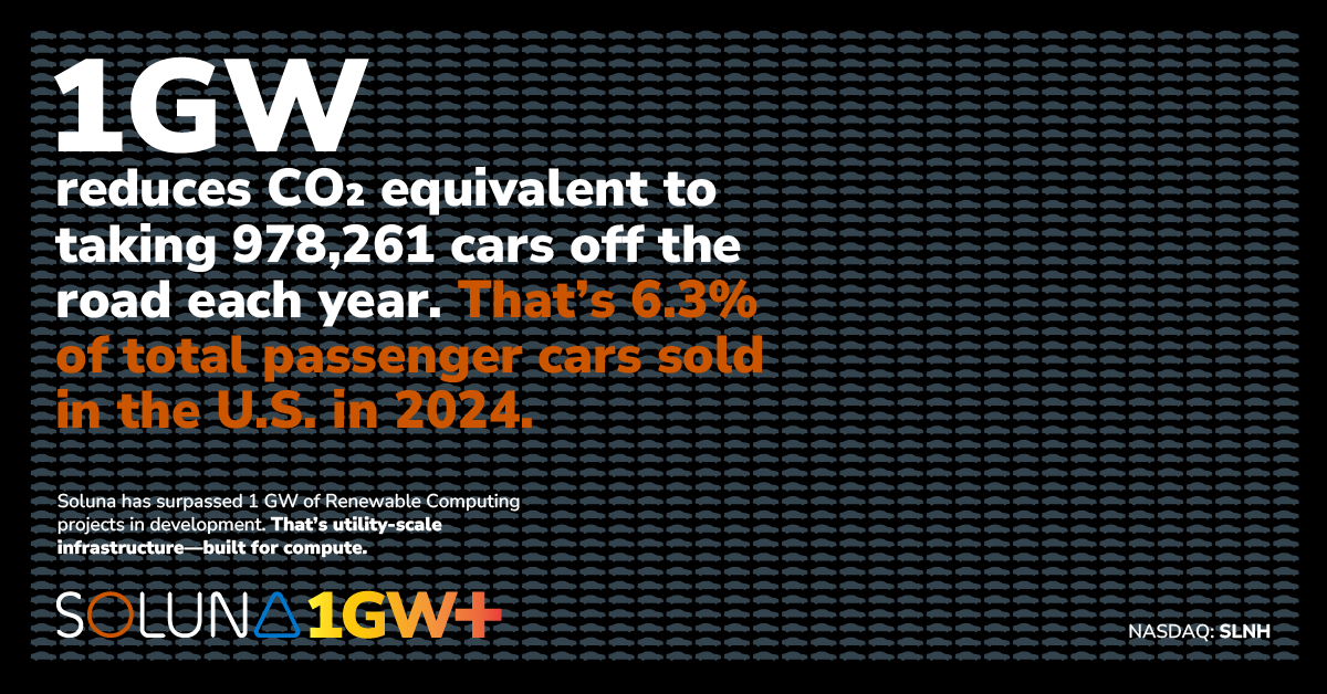 1 GW reduces CO2 significantly; it’s equivalent to taking 978,261 cars off the road each year! That’s 6.3% of total passenger cars sold in the U.S. in 2024. That is the positive impact on the environment that Soluna is having.