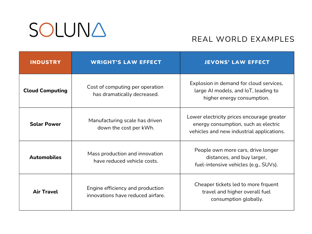 This isn’t just about efficiency gains. It’s about the economic forces that turn every breakthrough into a surge in demand. Two key principles—Jevons Paradox and Wright’s Law—prove that making AI models and hardware more efficient doesn’t curb resource consumption. Instead, it can drive even greater use, accelerating the need for more data centers, more computing power, and most critically, more sustainable energy solutions.