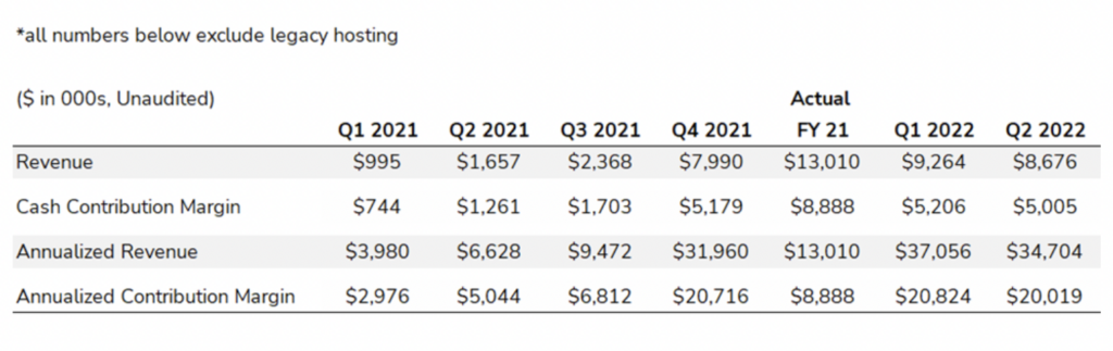 - Revenue in the second quarter decreased only 6.3% from the prior quarter to $8.7 million despite a 21.3% decline in average BTC prices ($41k in Q1 down to $33k in Q2).