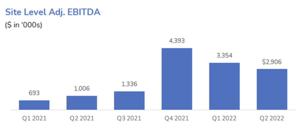 - Adjusted Site-level EBITDA for the three months ending June 30th, 2022 increased 2.9x to $2.9 million from $1.0 million in 2021.
