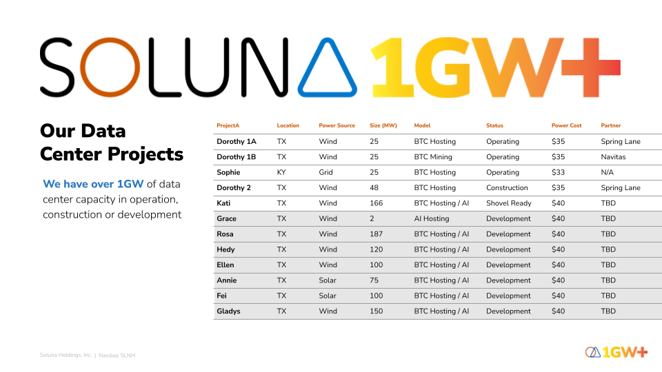 - Surpassed One Gigawatt of Clean Computing Projects – With the addition of Project Gladys (150 MW under development, wind) and Project Fei (100 MW under development, solar), Soluna’s now exceeds 1 GW of renewable-powered computing in operation, construction, and development. This milestone reflects the scalability of Soluna’s behind-the-meter model and marks a major step toward our 2.8 GW long-term roadmap. Learn more here.