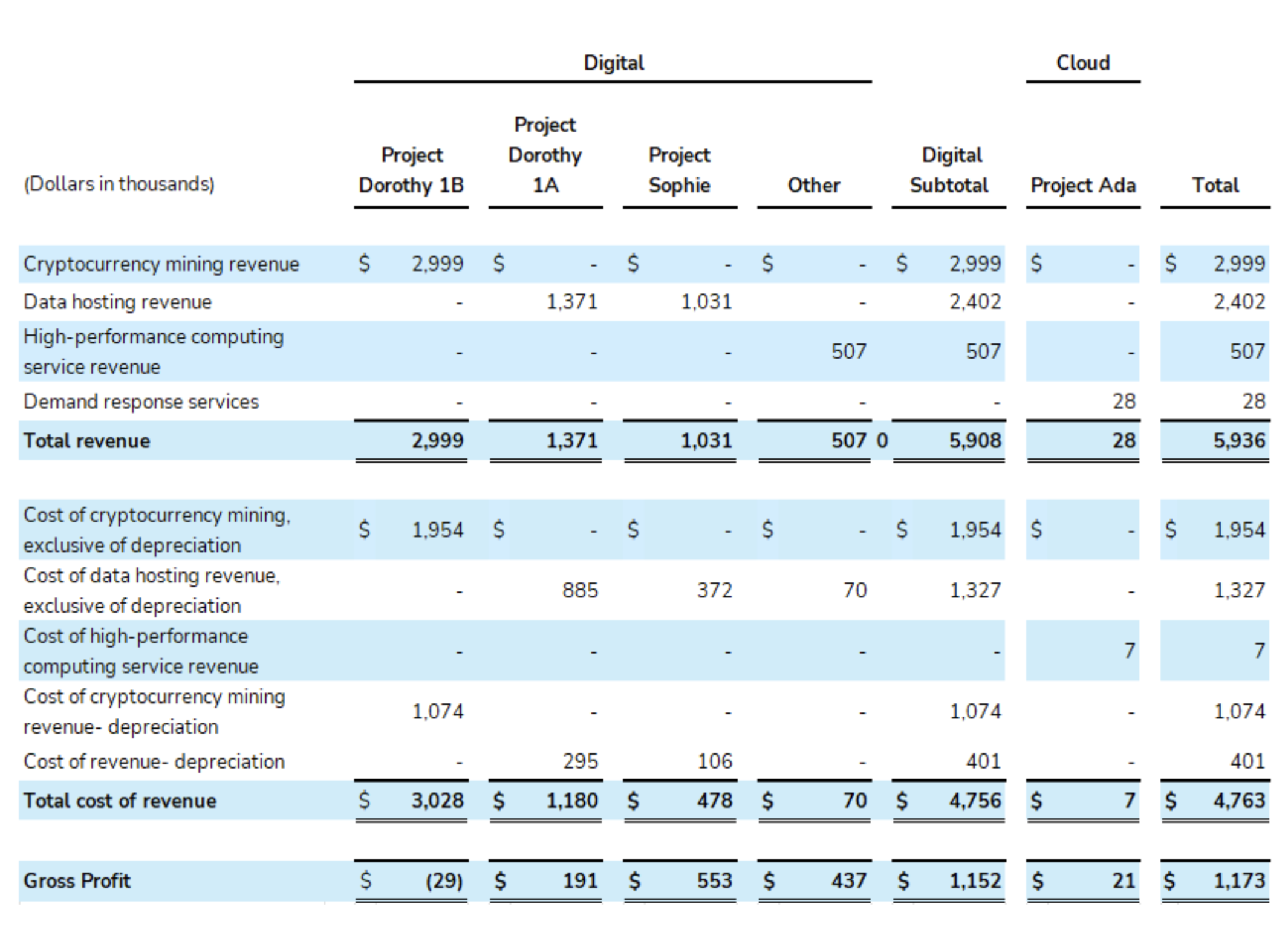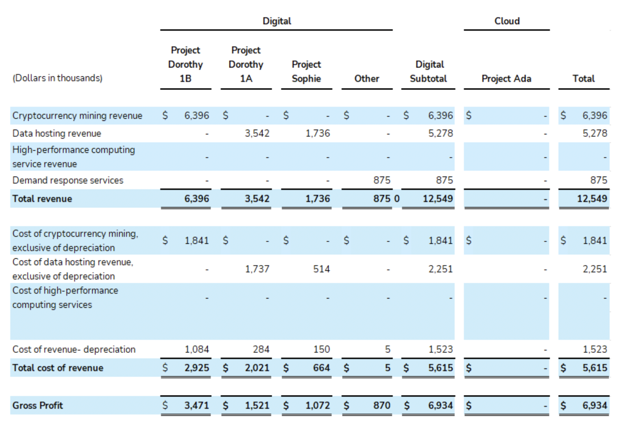 The following table summarizes the balances for the project sites for cryptocurrency mining revenue, data hosting revenue, high-performance computing service revenue, demand response revenue, cost of cryptocurrency mining revenue, exclusive of depreciation, cost of data hosting revenue, exclusive of depreciation, cost of high-performance computing services, and cost of depreciation during the three months ended March 31, 2024: