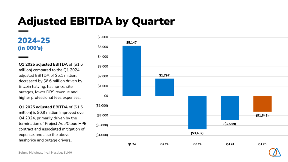 - Adjusted EBITDA Improved Q4 2024 to Q1 2025 – $0.9 million improved over Q4 2024, primarily driven by the termination of Project Ada/CloudCo HPE contract and associated mitigation of expense, and also the above-mentioned hash price and outage drivers.