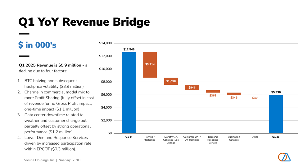 - Short term Revenue Decline – Revenue declined when compared to same period in 2024, due to four factors: 1) BTC halving and subsequent hash price volatility, 2) change in commercial model mix to more Profit Sharing (fully offset in cost of revenue for no Gross Profit impact; one-time impact), 3) data center downtime related to weather and customer change out, partially offset by strong operational performance, and 4) lower Demand Response Services driven by increased participation rate within ERCOT.