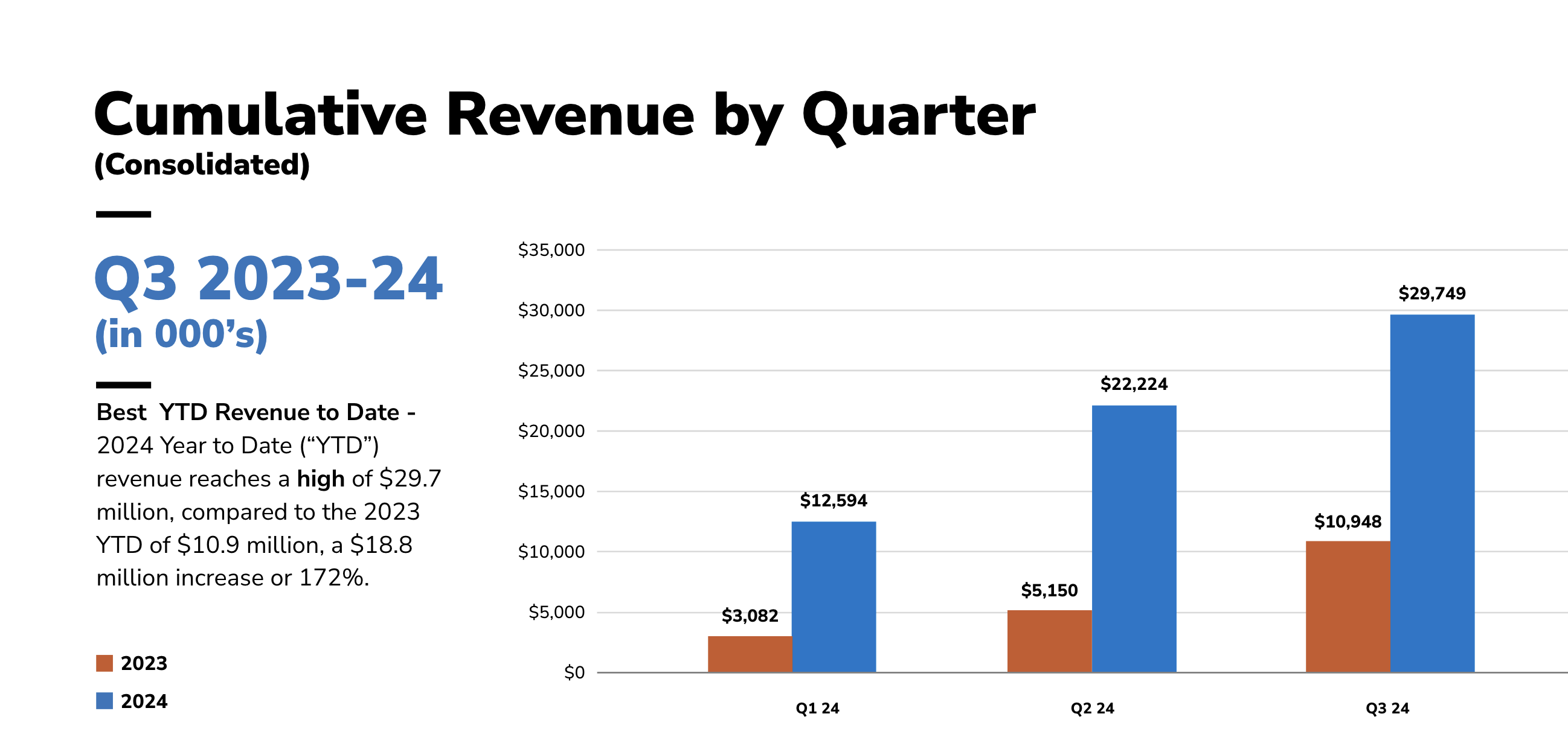 • Best YTD Revenue to Date – 2024 Year to Date (“YTD”) revenue reached a high of $29.7 million, compared to the 2023 YTD of $10.9 million, a $18.8 million increase or 172%.