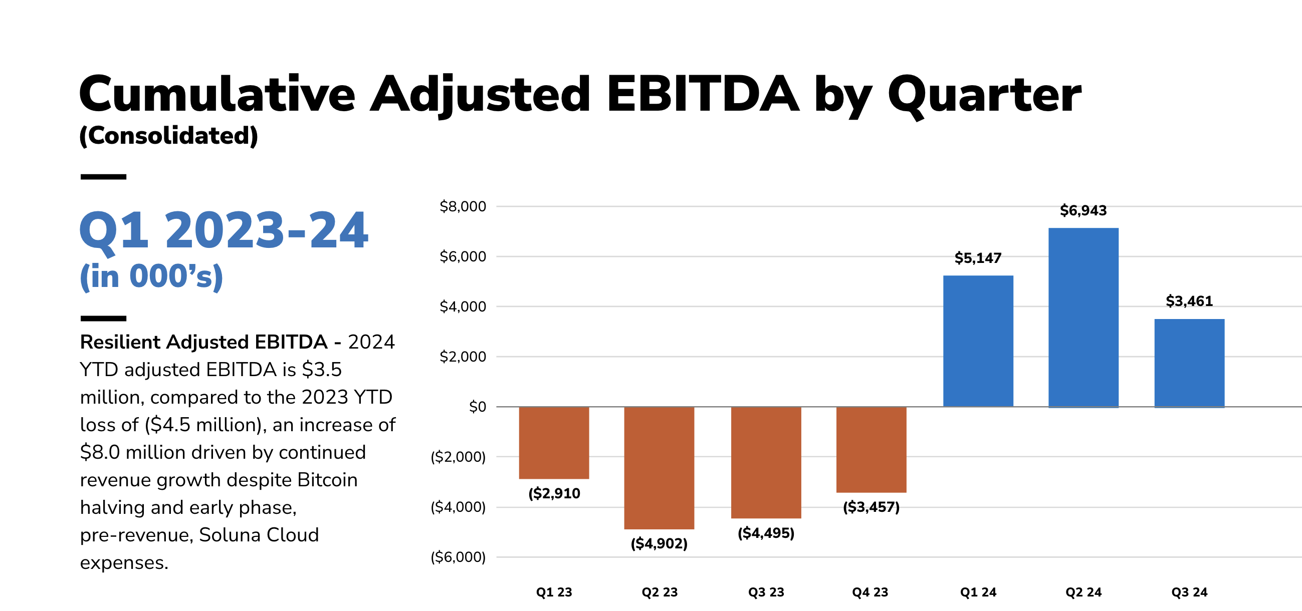 • Resilient Adjusted EBITDA – 2024 YTD adjusted EBITDA is $3.5 million, compared to the 2023 YTD loss of ($4.5 million), an increase of $8.0 million driven by continued revenue growth despite Bitcoin halving and early phase, pre-revenue, Soluna Cloud expenses.