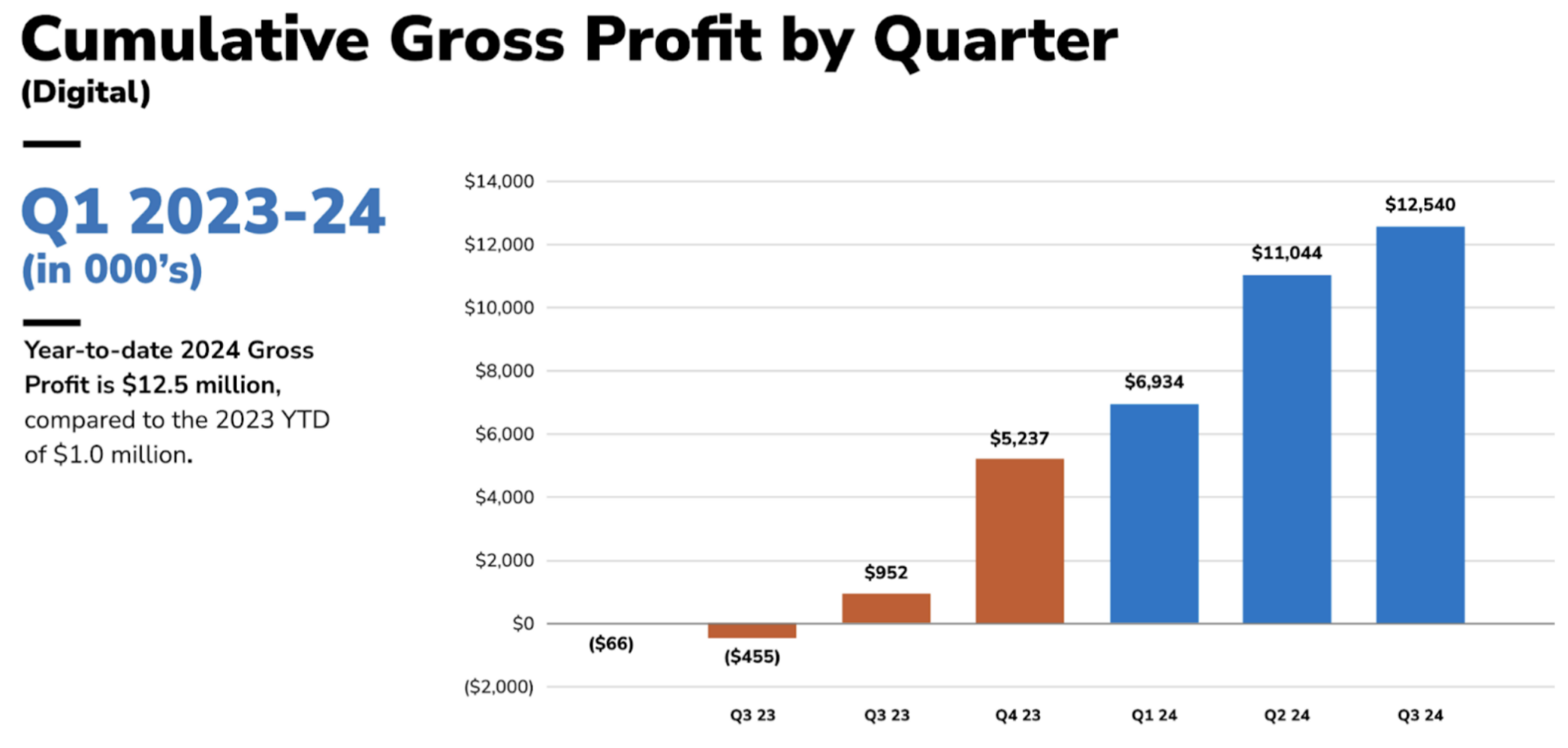 • Year-to-date 2024 Gross Profit is $12.5 million, compared to the 2023 YTD of $1.0 million.