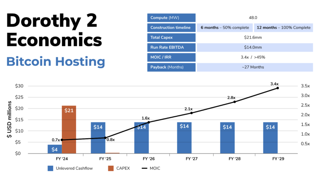 Compelling Financial Profile – Project Dorothy 2 is the second phase of Soluna’s flagship 100 MW data center, powered by renewable energy. It is expected to be one of the lowest-cost facilities of its kind in North America. According to the company’s financial modeling, Project Dorothy 2 has the potential to generate up to $14 million of additional annualized project-level operating profits for the Company in Bitcoin Hosting revenue. The project forecasts an outstanding return on invested capital, returning capital invested in about 27 months.